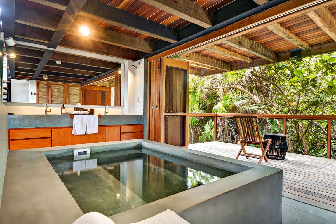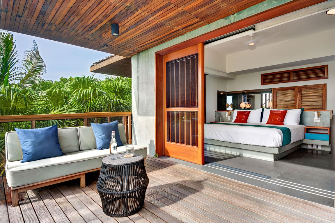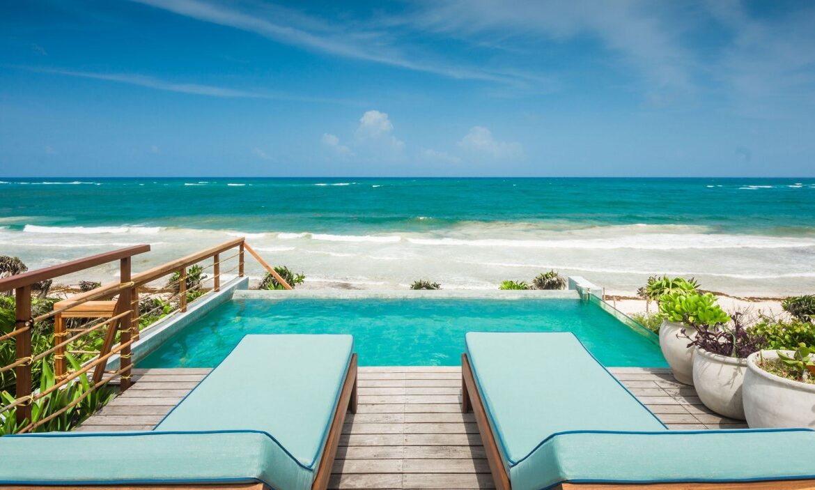 Beyond the main palapa, natural dunes with palm trees and cozy hammocks lead to an impressive private stretch of white sand beach. Ascend to the upper level, and you’ll find mesmerizing 360-degree views of the 4.5-acre property, with the lagoon on one side and the Caribbean Sea on the other. The rooftop terrace, an ideal spot for morning yoga and watching spectacular sunsets, also features an infinity pool where you can spend hours relaxing and gazing at the ocean.