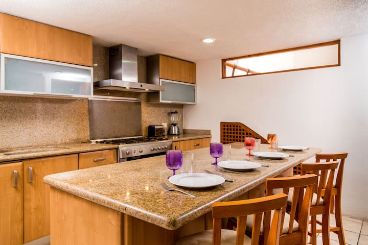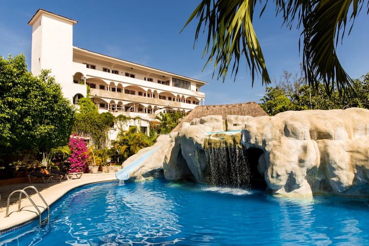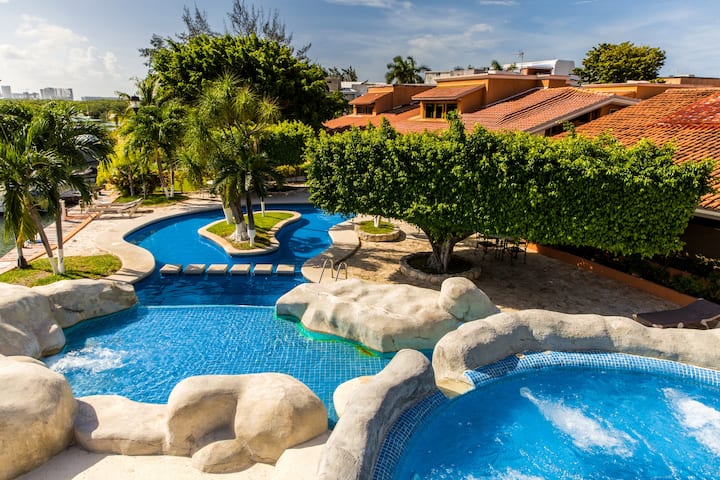This accommodation is located in the heart of Cancun's hotel zone. Right in front of the main hotels and beaches. However, it is situated on a quiet street by the lagoon. This is the perfect vacation home for friends and family. Relax and enjoy the sunny days while the kids swim in the pool and play on the water slide. Don't worry about cleaning, as this accommodation includes daily housekeeping service.