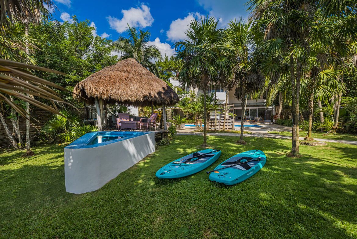 Additionally, the lush backyard boasts a 10-meter pool overlooking the ocean, and there is also a handcrafted jacuzzi next to the palapa. On the rooftop garden, you’ll find comfortable loungers and breathtaking sunsets.
