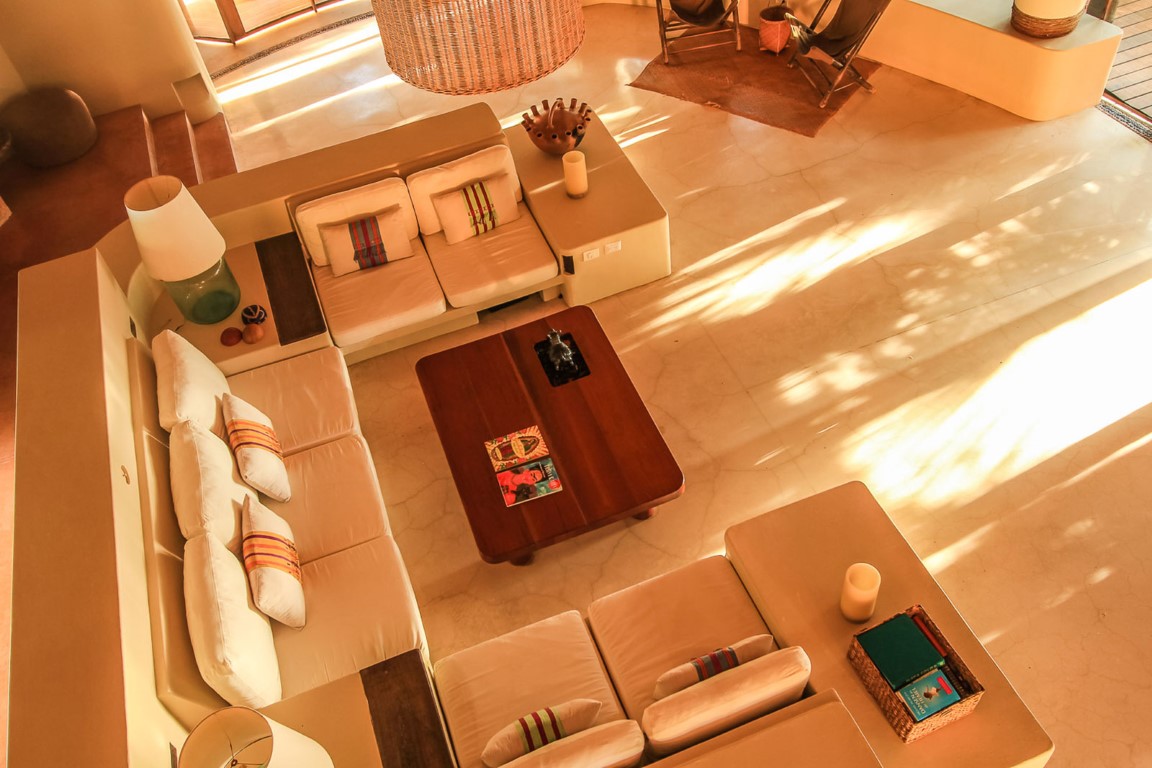 The living area is at the center of the house, featuring a large sofa where you can play board games, watch movies on a 120″ cinema screen, listen to music, or simply enjoy the ocean views.