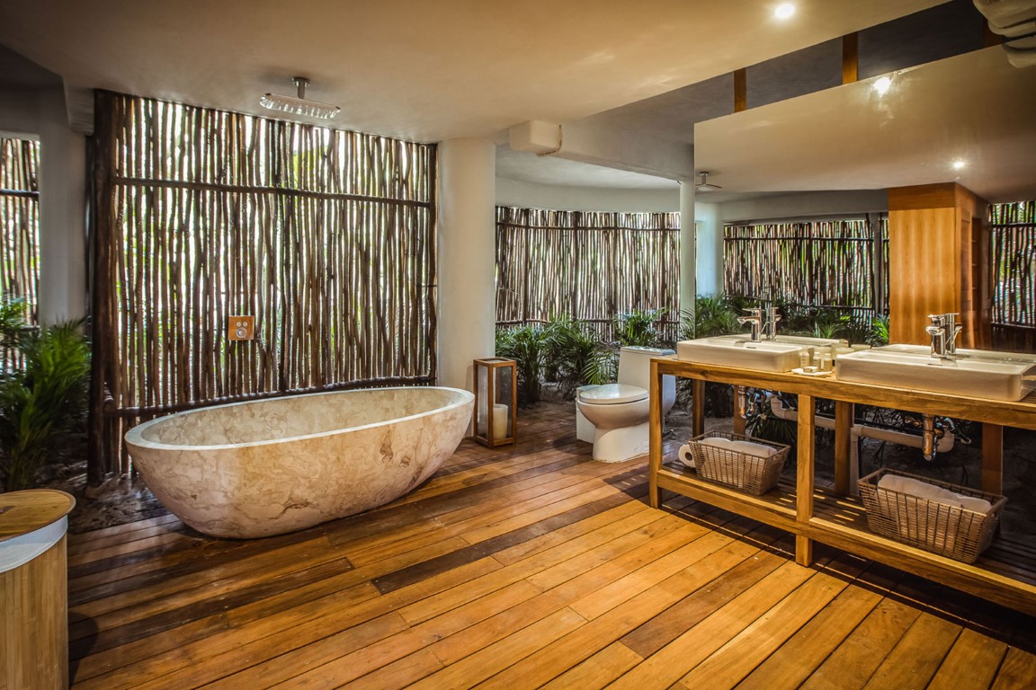 The villa has five air-conditioned bedrooms (including a loft bedroom accessed by a ladder) and 4.5 bathrooms. The master bedroom with an en-suite bathroom has a king-size bed, its own terrace, chairs, and a hammock. On the other side, two additional bedrooms have one king-size bed and two double beds, a large terrace, two balconies, and share a bathroom (subject to the ecological restrictions of the reserve).