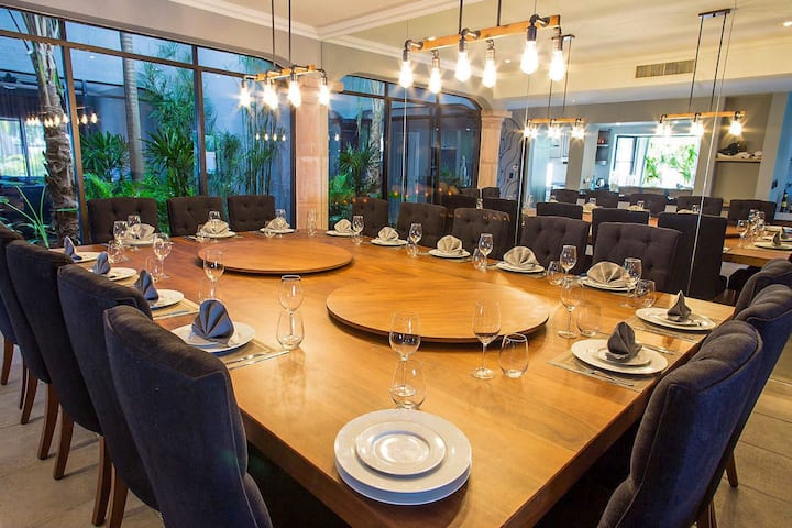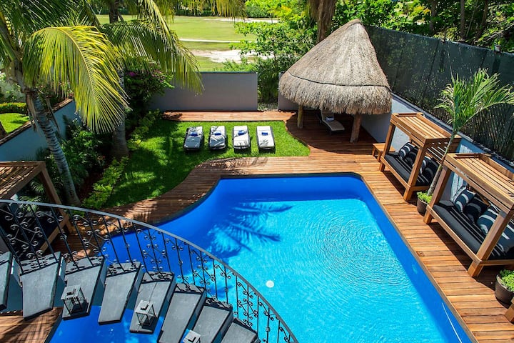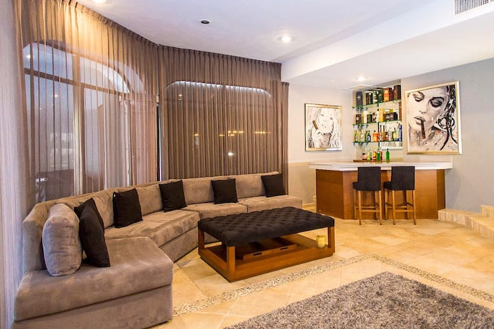 Vacaciones con estilo con familiares y amigos en nuestro exótico y emocionante “Bachelor Pad” de Cancún. Relájate… ¡Nosotros nos encargaremos de todo lo que necesites! Disfruta de todos los servicios que la villa tiene para ofrecer; desde un equipo completo de personal, jacuzzi, piscina, azotea con vistas impresionantes de Cancún, cómodas camas de día, televisores de pantalla plana, Internet de alta velocidad y mucho más…