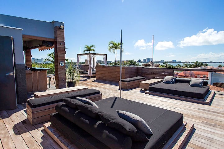This unique villa is located in the heart of Cancun’s Hotel Zone, within walking distance of all the hotels and nightlife Cancun has to offer. Spend your day on our rooftop with 360-degree views of Cancun city.