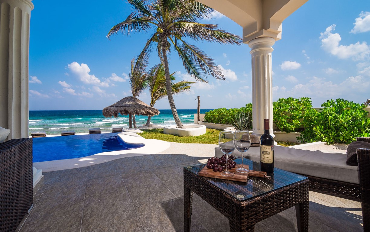Al borde de la terraza hay una gran piscina infinita con vistas a la playa privada de arena y al mar Caribe. Una vista realmente majestuosa.