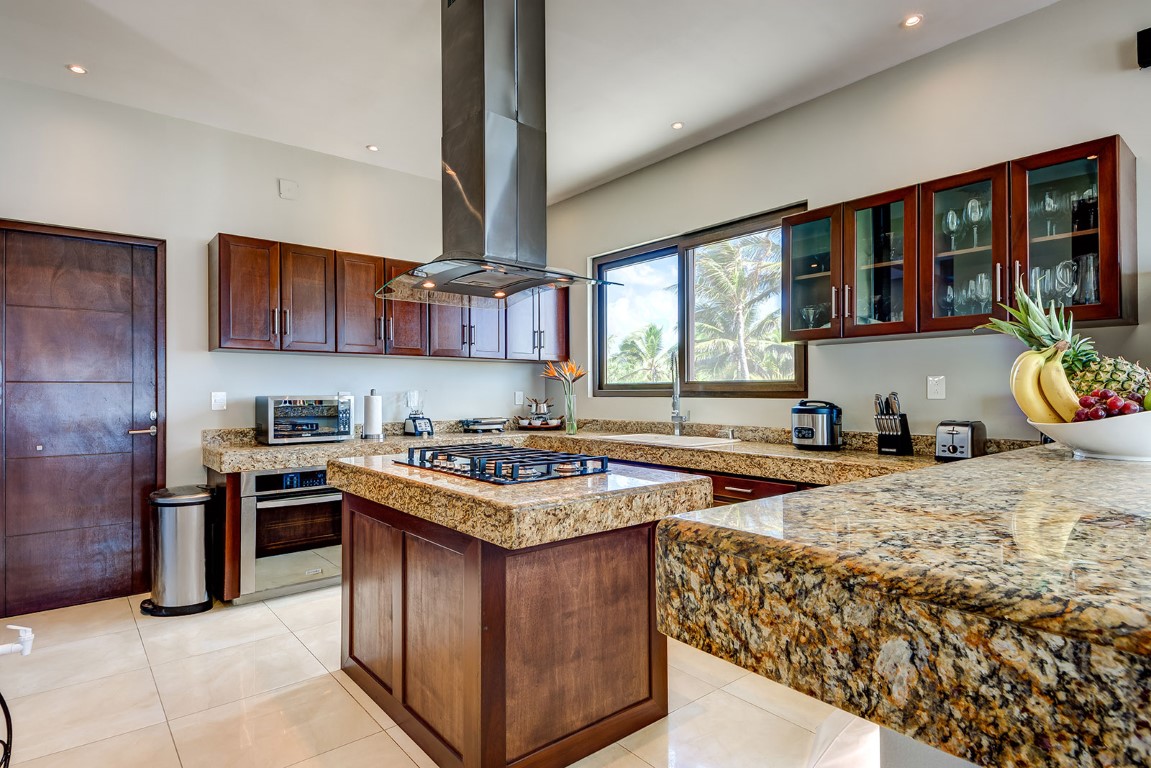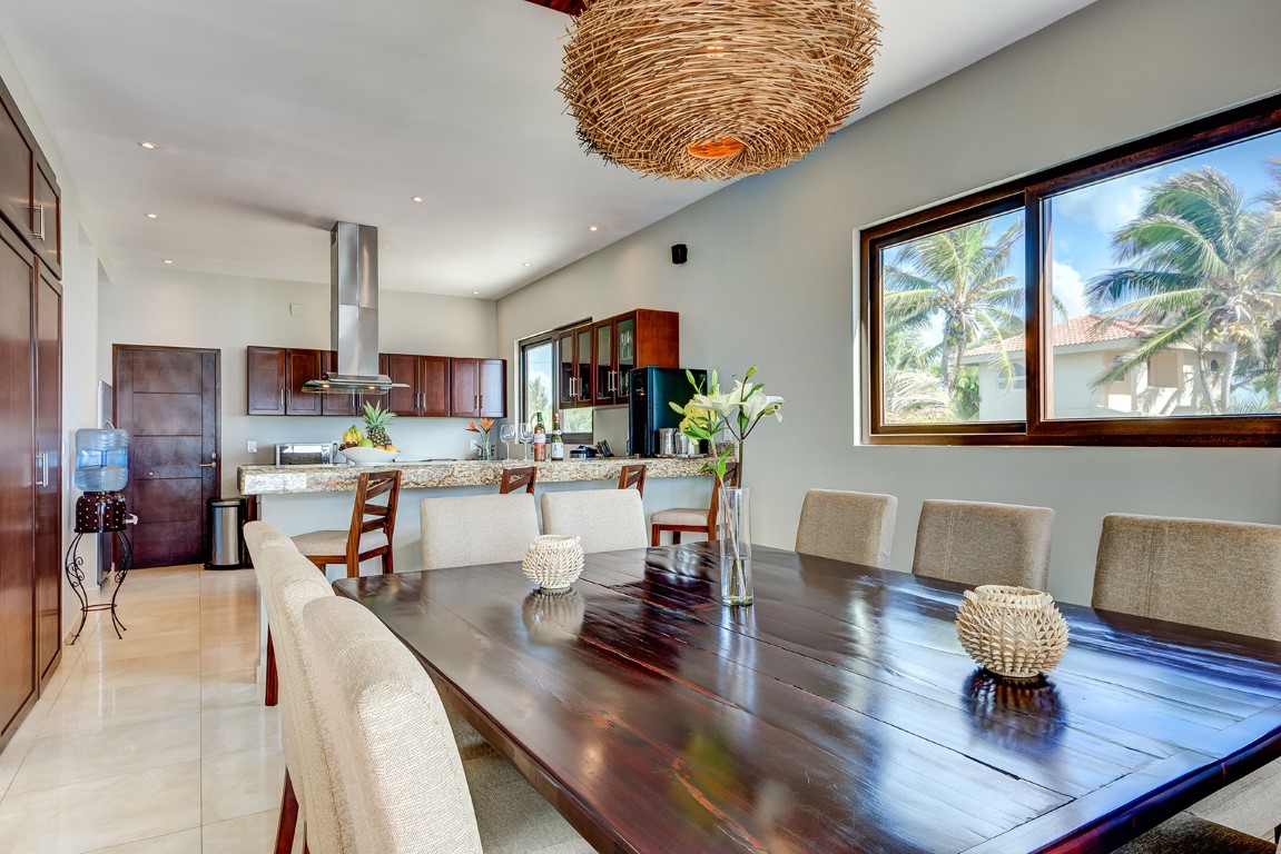 Justo enfrente de la playa hay una gran palapa que es perfecta para cenar al aire libre. Las áreas de comedor interior y exterior tienen suficiente espacio para acomodar cómodamente a 10 personas.