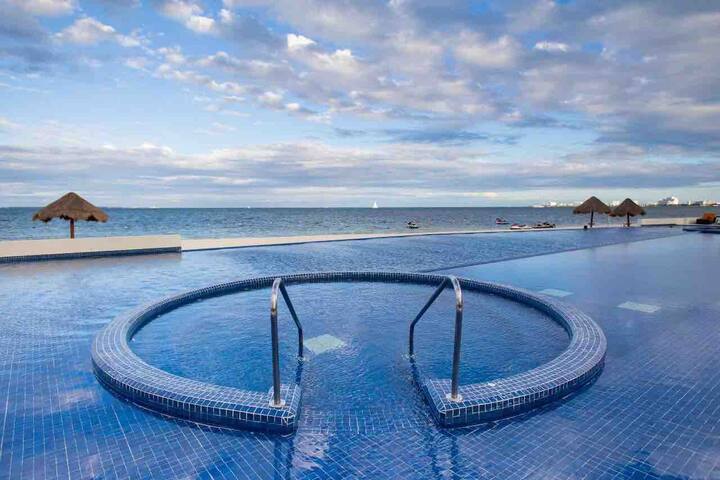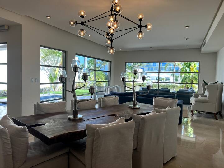 Ven a echarle un vistazo a nuestra lujosa villa frente al mar. Ubicado en la comunidad cerrada más exclusiva de Cancún. Los cuales incluyen todos sus servicios. Tales como; playa de arena blanca, 2 canchas de tenis, gimnasio, parque infantil y sala de juegos, 3 piscinas comunitarias y 1 piscina infinita privada en el patio trasero.