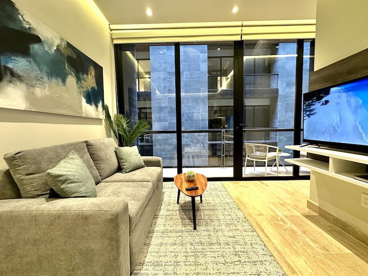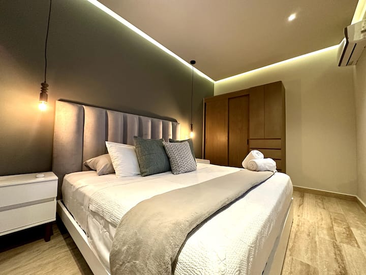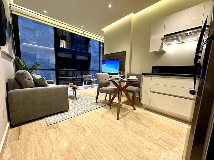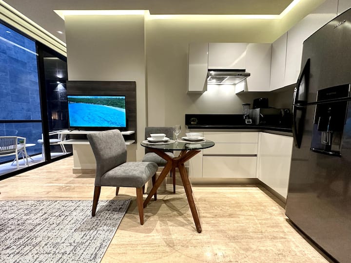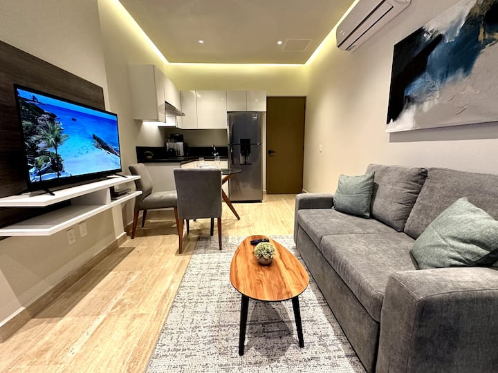 Acogedor departamento con una hermosa habitación, acondicionada con toallas para baño y playa, caja fuerte y aire acondicionado; cuenta con una agradable sala con TV, cocina equipada con microondas, cafetera, y parrilla de inducción, un acogedor comedor y un balcón con una increíble vista. El departamento cuenta con acceso a internet.