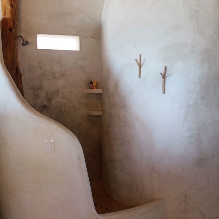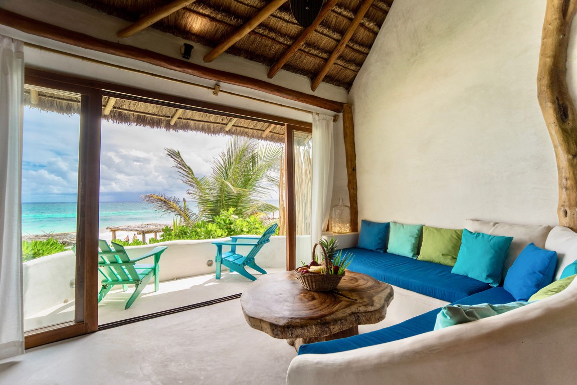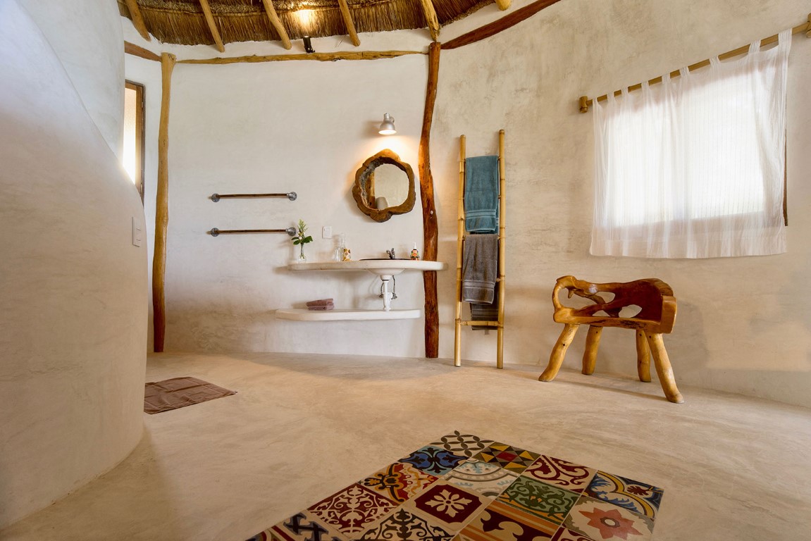 El espacio de vida de concepto abierto crea una conexión perfecta con el exterior. Hay un área de descanso con cojines en la veranda y una ducha al aire libre en medio de la exuberante vegetación. En el interior, elementos y detalles artísticos le dan a la casa una sensación única de playa en Tulum.
