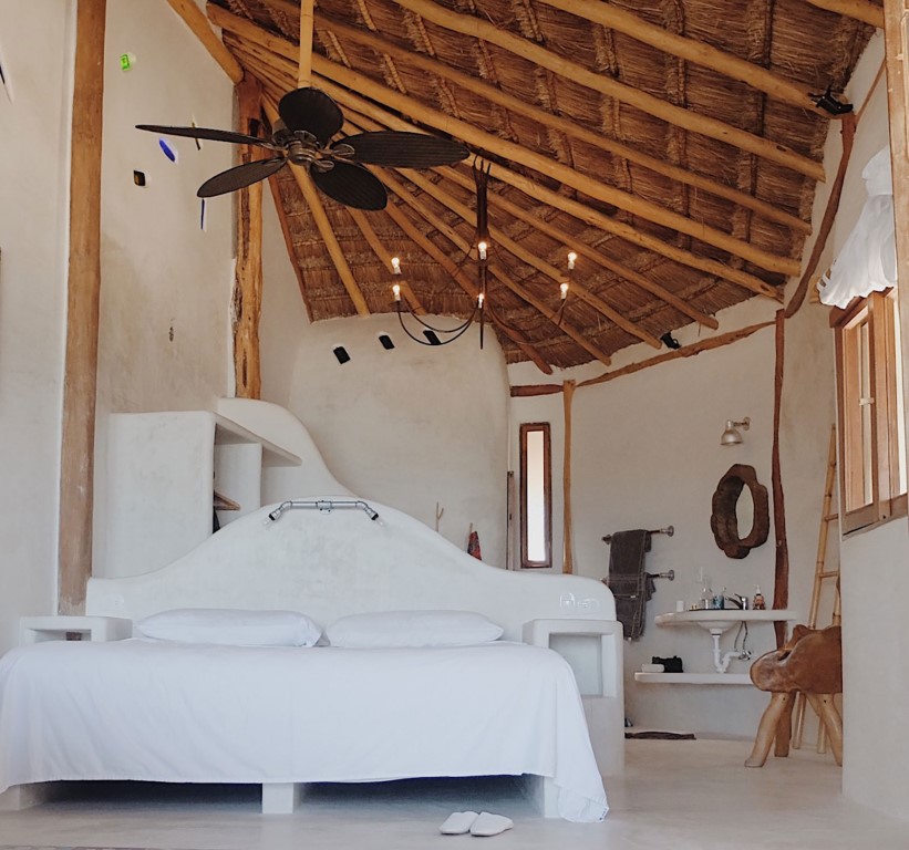 Todo el piso superior es una suite principal con un hermoso techo de palapa, cama king-size y un balcón frente al mar. El dormitorio captura la brisa del mar y se mantiene cómodo incluso en el calor. Hay un baño privado con ducha. La habitación es luminosa y espaciosa.